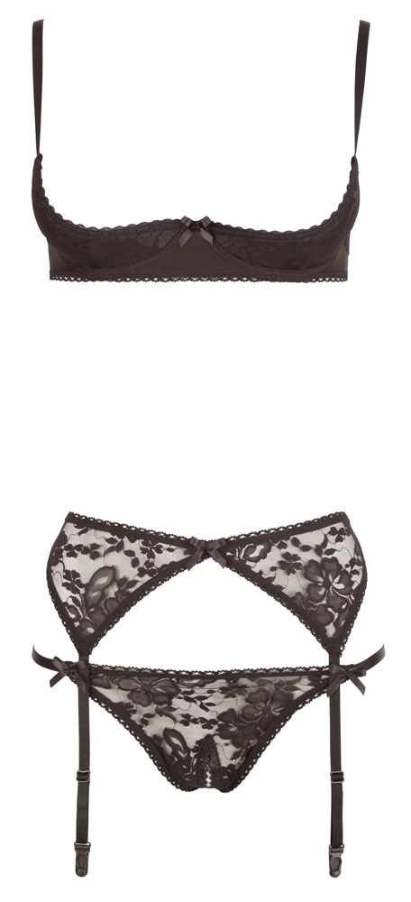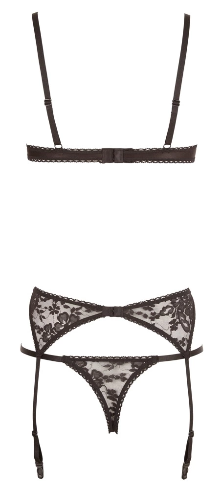 This exclusive set combines three coordinated pieces designed for comfort and sophisticated style. Each element is crafted from high-quality, stretchable black lace that adapts seamlessly to your body shape.