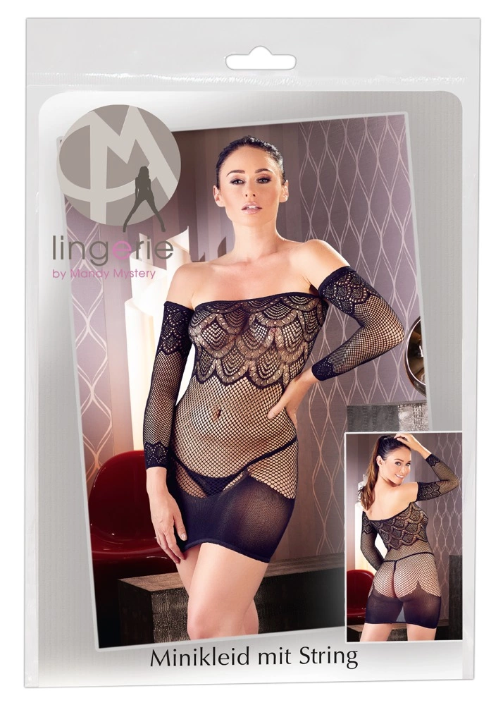 - Includes: 1 net mini dress with gauntlets, 1 string