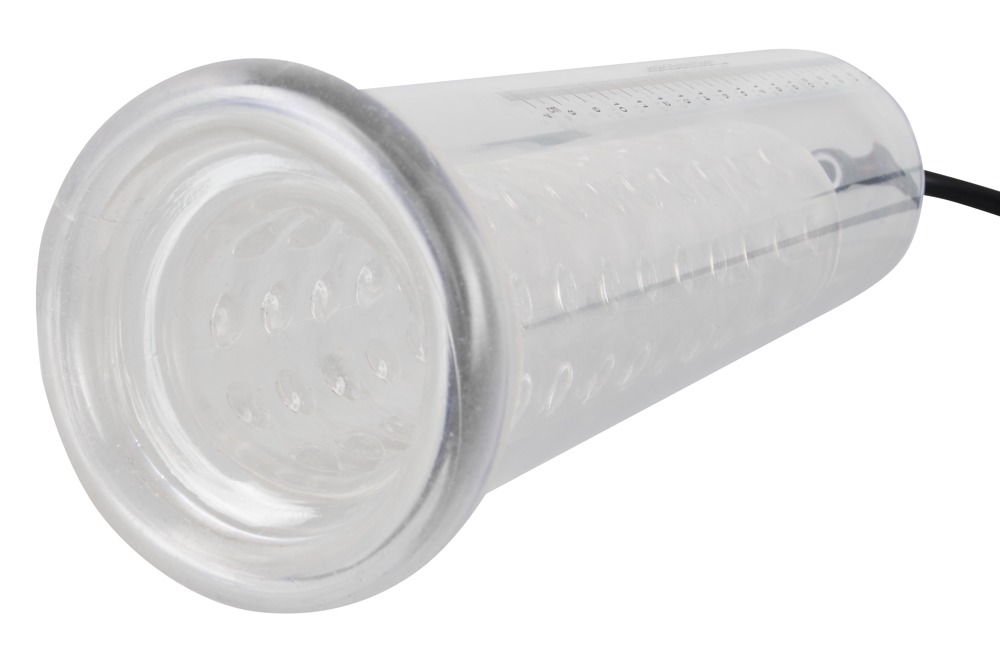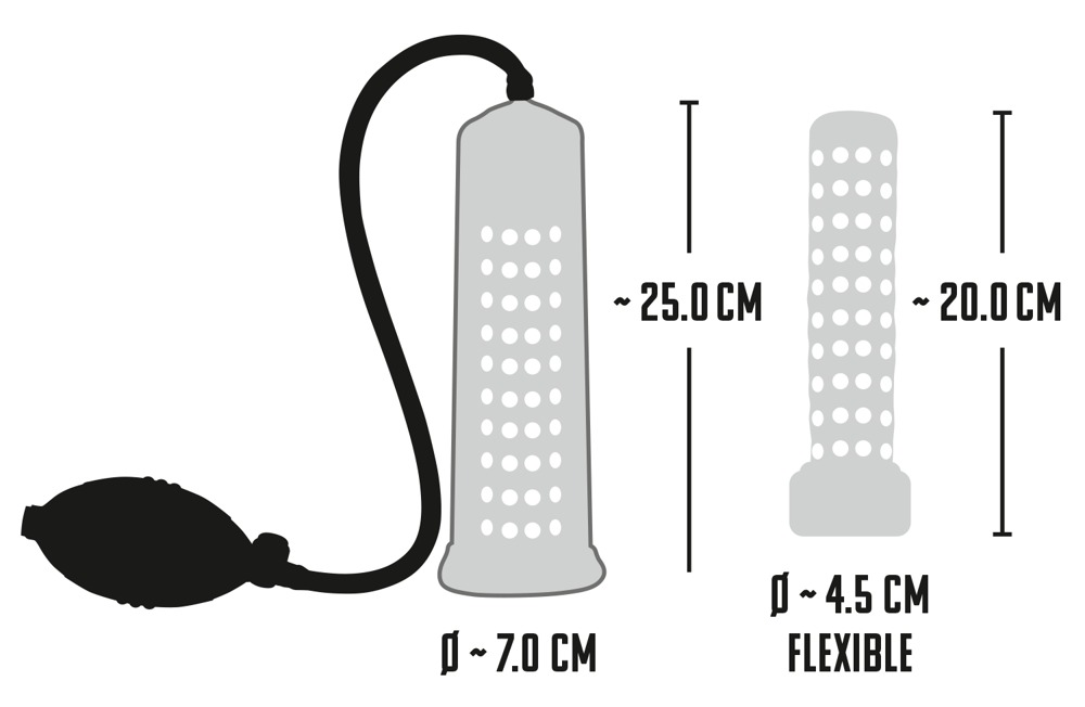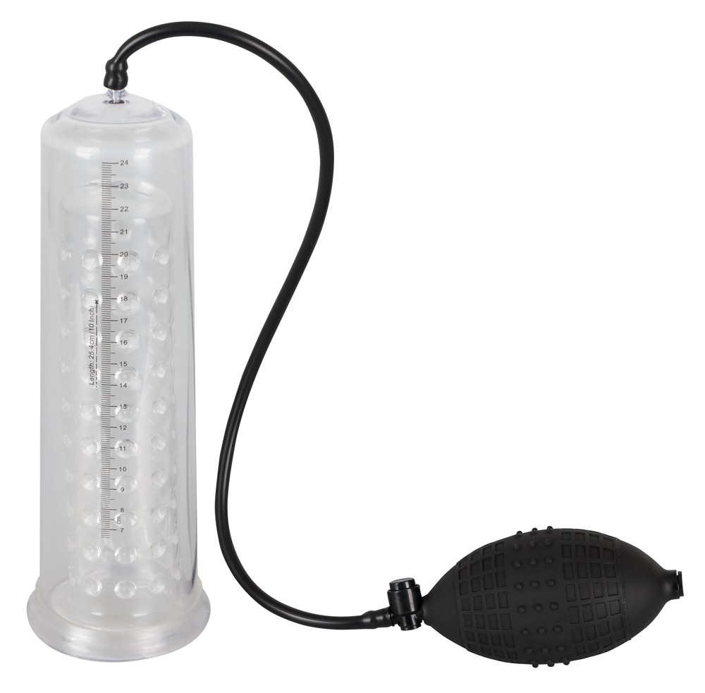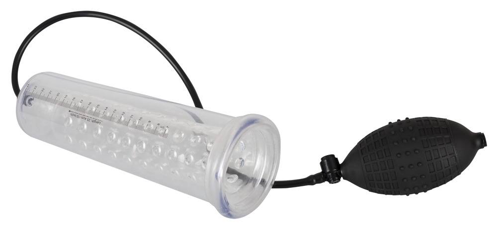 Transparent penis pump with a knobbed inner sleeve (Ø 4.5 cm flexible, length approx. 20 cm) and handy pump ball. You can see the success of how much your penis has increased by with the scale. With a safety pressure valve. Cylinder approx. 25 cm long. Material: ABS, TPE (sleeve), PVC (pump ball).