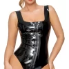 - Fastening: Zip runs from the front over the intimate area to the top of the back