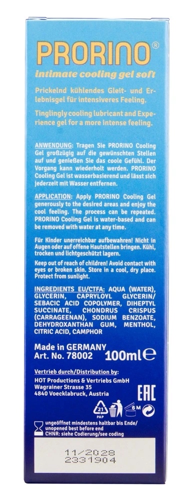 The clear, dermatologically tested composition is suitable for all skin types and does not stain fabrics, making it a discreet and practical addition to your intimate care routine. Ideal for individuals and couples, the PRORINO Cooling Gel Soft combines effective lubrication with a cooling experience, enhancing the quality of personal moments.