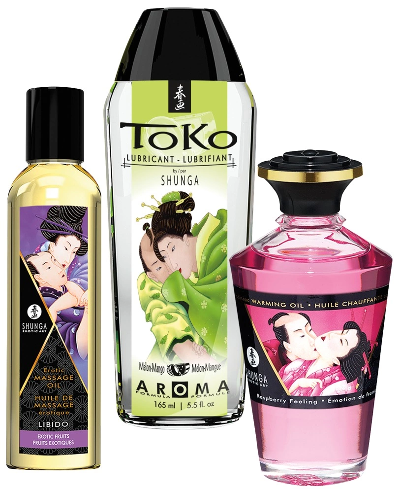 - 3-piece luxury set: massage oil, warming oil, flavoured lubricant
