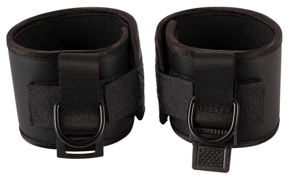 - Soft, padded handcuffs connected by a flexible fabric strap