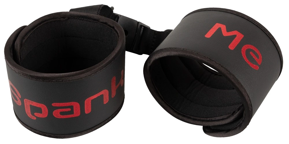 The black cuffs are elegantly accented with the phrase “Spank Me” in vibrant red, adding a distinctive visual touch. The hook and loop fastening system offers full adjustability to fit a range of wrist sizes, providing a secure hold without sacrificing comfort. Lightweight construction and gentle polyurethane material ensure prolonged wear is pleasant and non-restrictive on the skin.