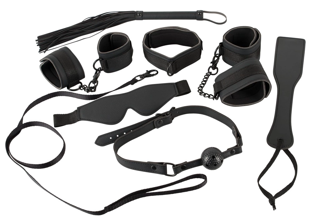 - Set includes: collar with leash, blindfold, gag with breathing holes, flogger, paddle, handcuffs, and ankle cuffs