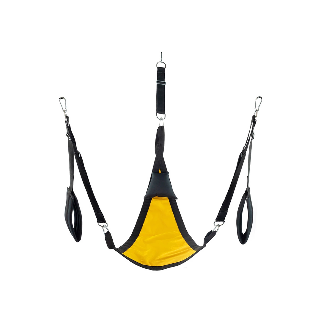 Adaptable to various setups, the sling accommodates both 3 or 4 attachment points, allowing you to adjust according to your preference and space requirements. The set includes four strong metal carabiner hangers for secure mounting, two wide padded foot supports (11 cm each) for enhanced positioning, and a soft black triangle cushion (24 x 20 cm) for additional comfort and support.