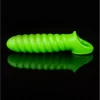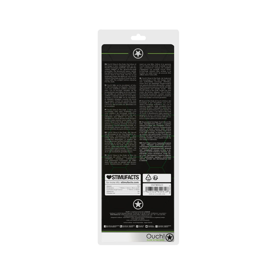 The fluorescent neon green surface glows brilliantly after exposure to natural or artificial light, making it a standout addition to any intimate accessory collection. Whether used on its own or paired with other products from the Ouch! Glow in the Dark series, this flexible sheath is engineered for easy handling and maintenance.
