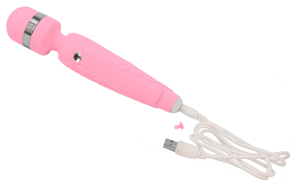 Pink, rechargeable vibrating wand with flexible massage head for targeted pleasure point or full-body massages. Extra strong motor for multi-speed vibration. With travel lock. Elegant detail: Sparkling Swarovski® stone as control button. Total length 20 cm, Ø 3.9 cm. Silicone, ABS. USB charging cable included.