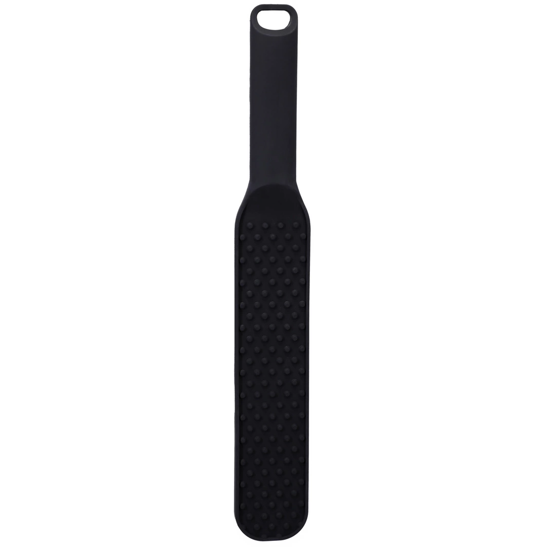 This model features a robust, dual-layer construction with a textured surface enhanced by evenly distributed raised dots. These elements offer additional grip and precision during use, making the paddle ideal for those seeking a more controlled and targeted experience. The bold black and red color scheme adds a contemporary aesthetic, while the sturdy vegan leather material ensures long-lasting quality and easy maintenance.