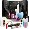 - Includes: a set of adjustable nipple clamps, a 10-speed silicone stimulator, a faux-feather tickler, two satin straps, a satin paddle, a satin blindfold, a silicone ball gag with satin straps, a 32 mm c-ring, a single-speed mini bullet (compatible with c-ring), and a matching satin storage pouch