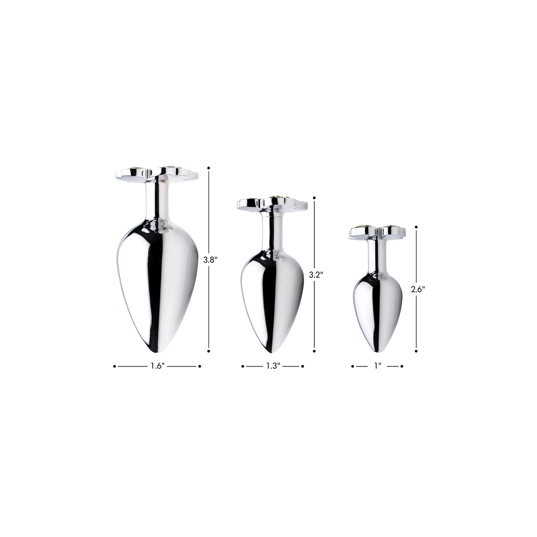 Discover sophisticated design and reliable quality with the XR Brands Lucky Clover Gem Metal Intimate Plug in a small, silver variant. Crafted for those who value both aesthetics and function, this model features a distinctive clover-shaped jewel at the base, offering a unique and elegant appearance. The small size makes it ideal for those seeking a compact and easily manageable addition to their collection.